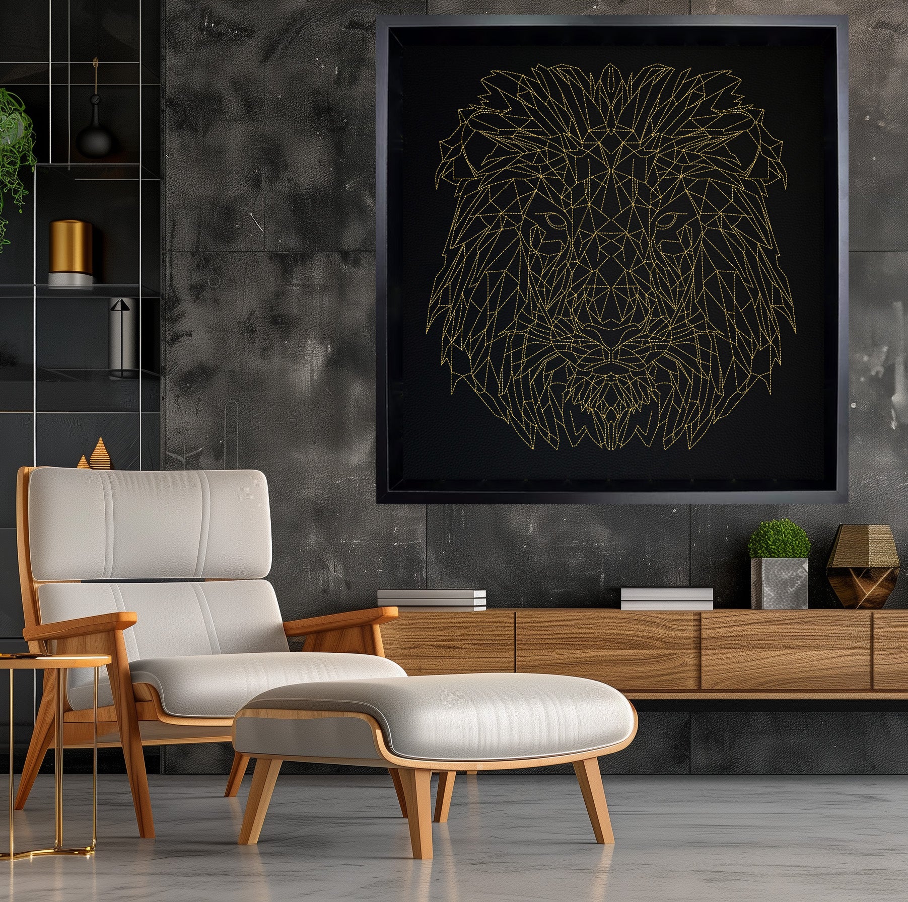 Wandkunst im Löwen-Design aus Leder: Gestickte Stiche